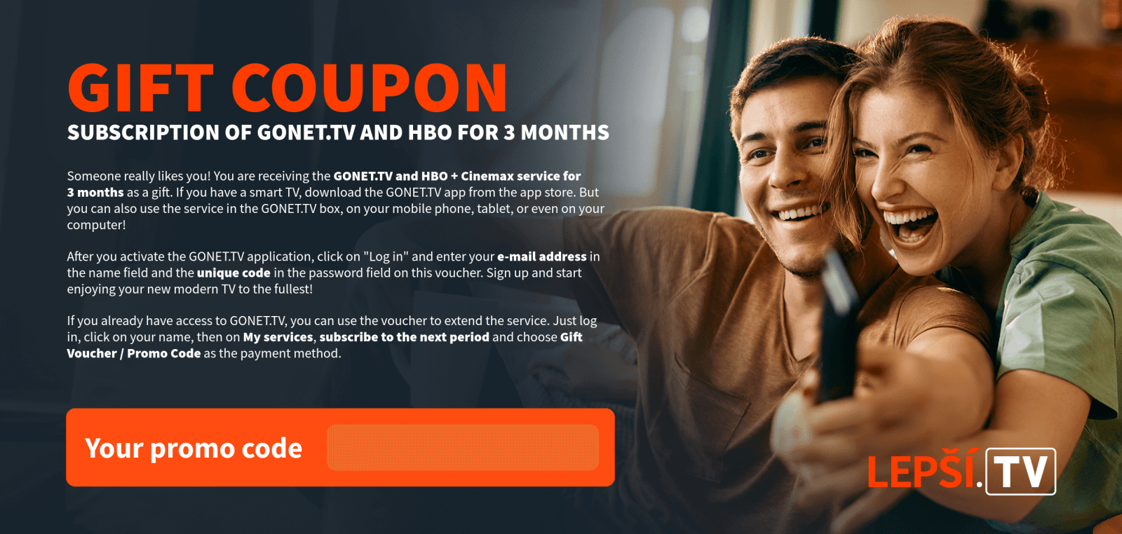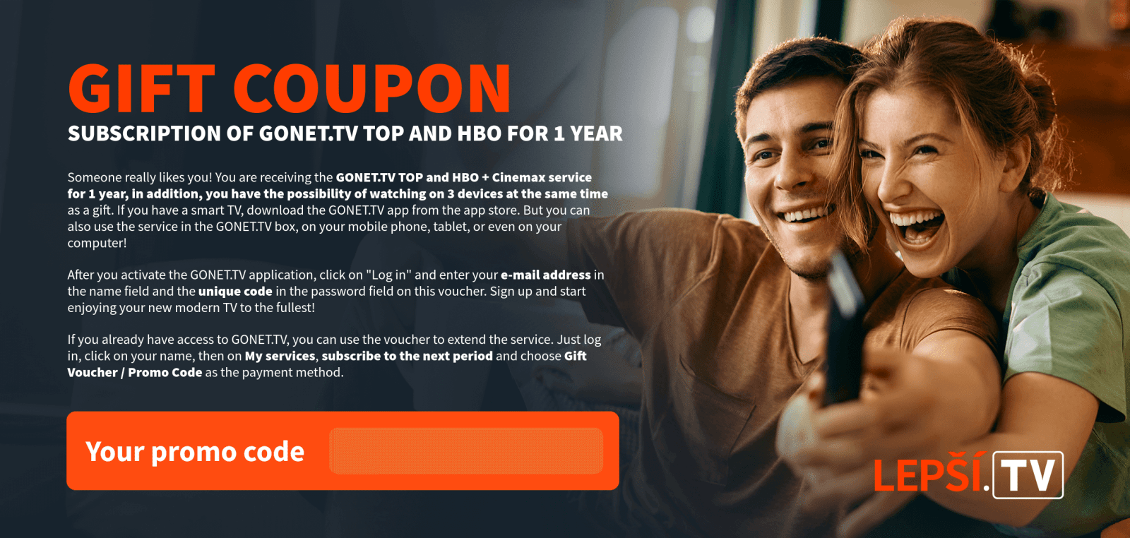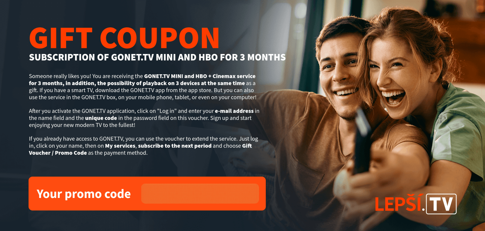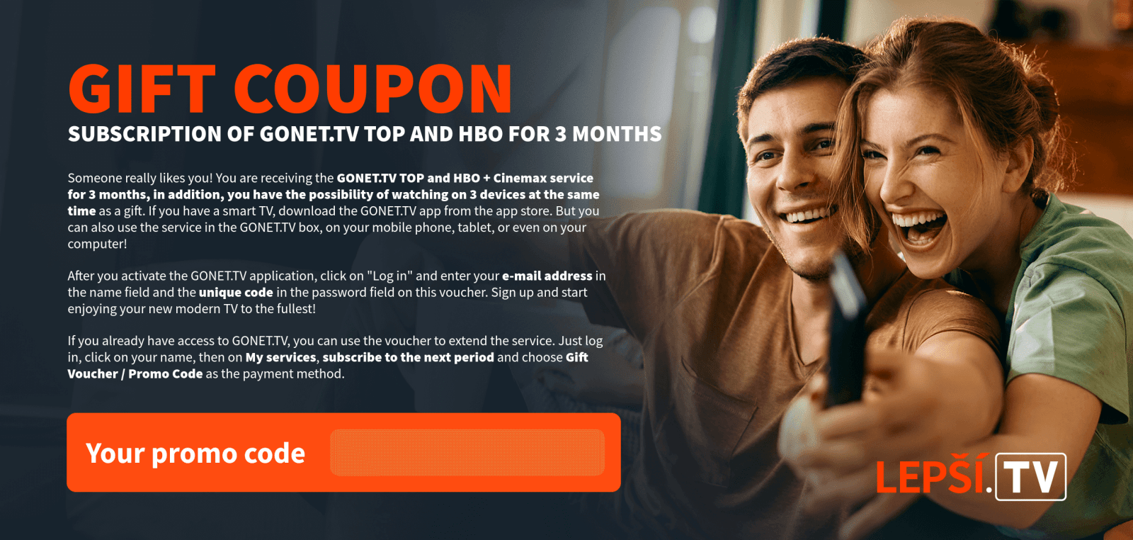 As soon as we receive your payment, the Lepší.TV service will be activated and we will inform you of the activation by e-mail.