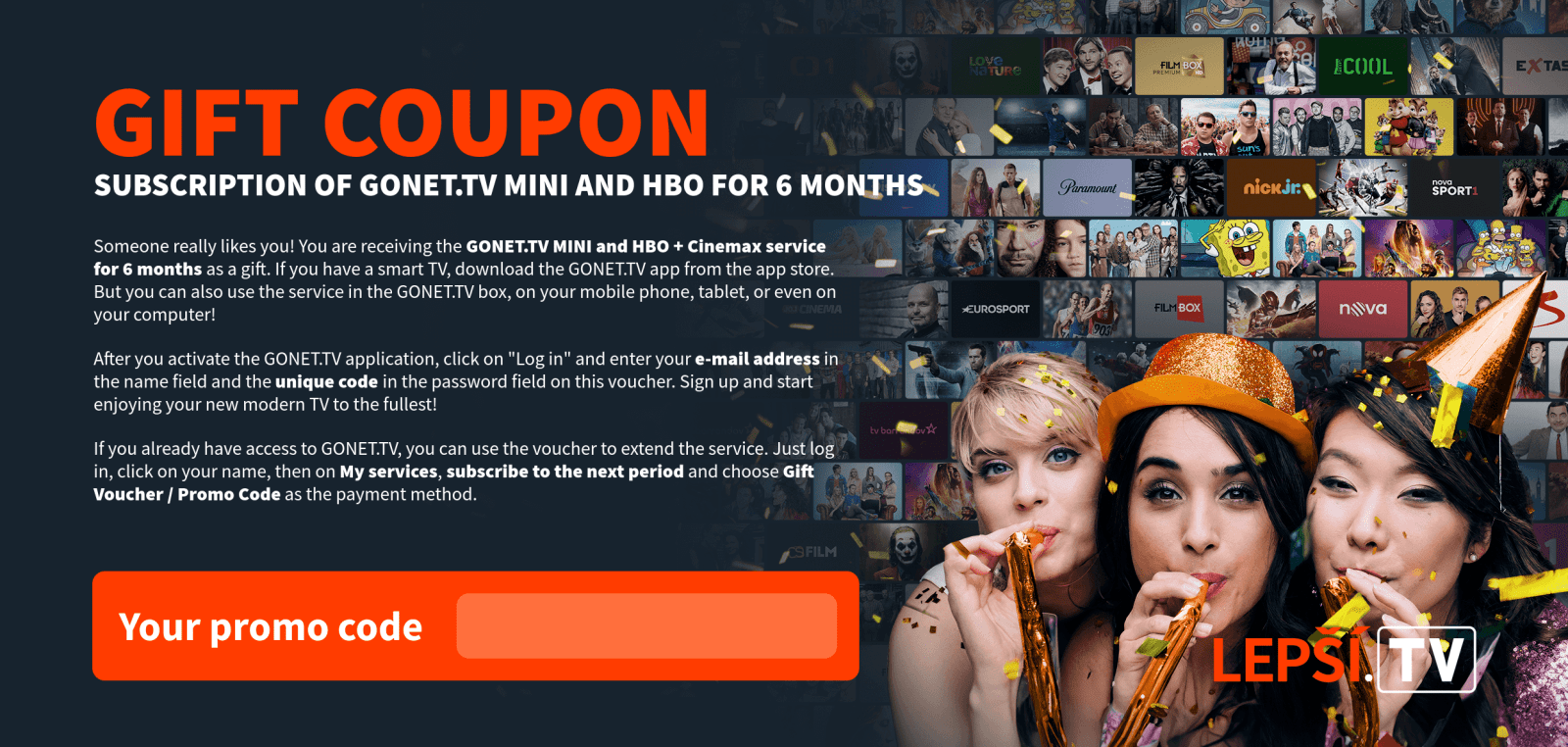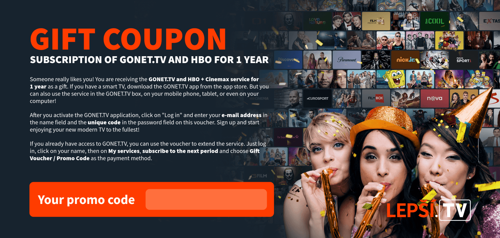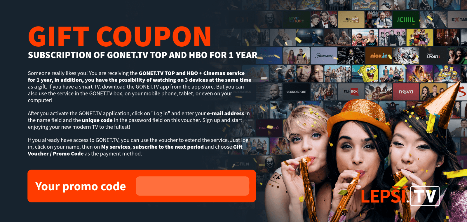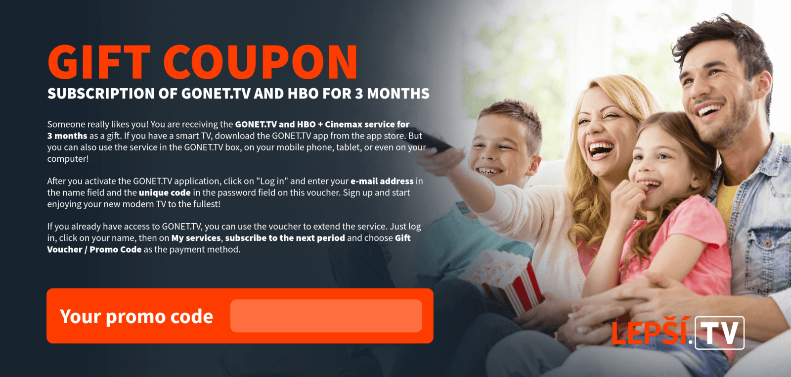 As soon as we receive your payment, the Lepší.TV service will be activated and we will inform you of the activation by e-mail.